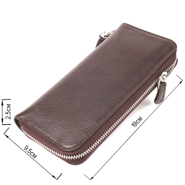 Вместительный женский кошелек, из натуральной кожи. Аксессуар имеет три основных отделения, в которые помещаются купюры всех номиналов, две перегородки, одна из них на молнии, восемь карманов для карточек, два прилегающих кармана и съемный кистевой ремень. Закрывается аксессуар на молнию. Отличный аксессуар, надежного производителя, который прослужит очень долго.