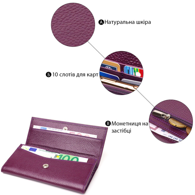 Красочный женский кошелек, из натуральной зернистой кожи. Аксессуар имеет два широких основных отделения, в которые помещаются купюры всех номиналов, карман перегородка на молнии, монетница, десять карманов для карточек, два прилегающих кармана и один скрытий карман. Закрывается аксессуар на клапаном на кнопку. Если Вы хотите порадовать и себя и удивить близких, то непеременно покупайте кожаные аксессуары в нашем магазине, качество и цена Вас однозначно порадует.