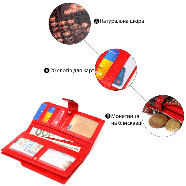 Интересный женский кошелек, из натуральной фактурной кожи, с тиснением под змею. Аксессуар имеет шесть прилегающих карманов, в которые поместятся купюры всех номиналов, вместительную монетницу и двадцать карманов для карточек. Закрывается аксессуар хлястиком на кнопку. Если Вы хотите порадовать и себя и удивить близких, то непеременно покупайте кожаные аксессуары в нашем магазине, качество и цена Вас однозначно порадует.