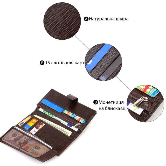 Вертикальный мужской бумажник из натуральной фактурной кожи с тиснением. Аксессуар имеет одно основное отделение, в которое помещаются купюры всех номиналов, пятнадцать карманов для карточек, карман под сеточкой для документов, два прилегающих кармана и монетницу. Закрывается аксессуар пополам кожаным хлястиком на кнопку. Упакован бумажник картонную коробку.