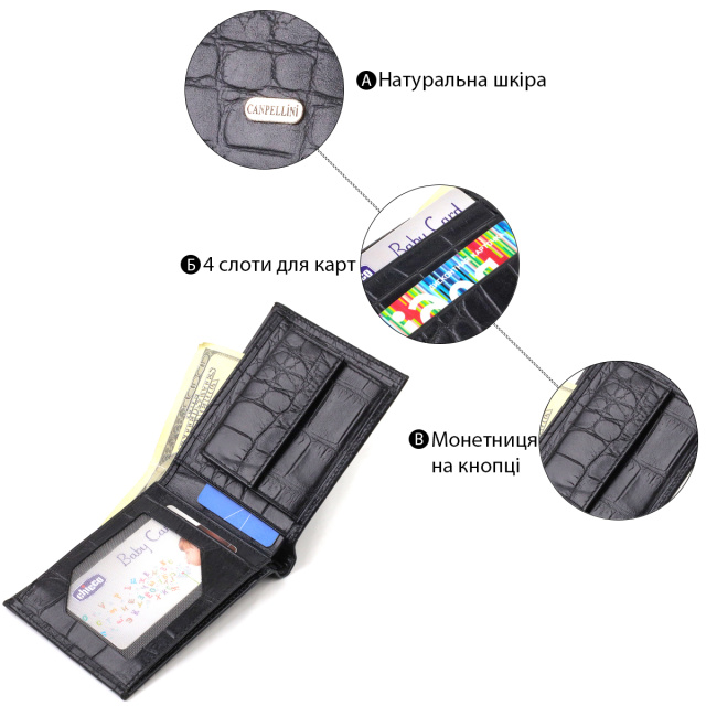 UA MarketКиївJANAВсе товарыТовари та послугиСумки мужскиеКошелькиМужские кошелькиМужской бумажник без застежки горизонтального формата из натуральной кожи с тиснением под крокодила CANPELLINI 21766 Черный