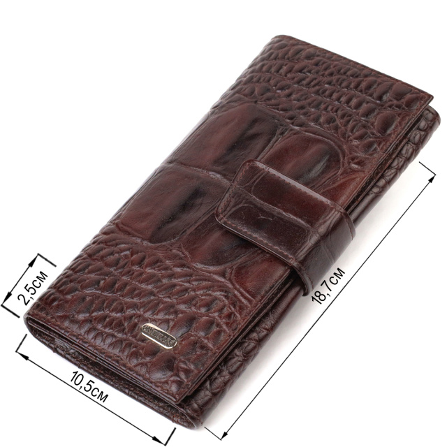 Практичное портмоне для стильных и уверенных в себе людей, изделие из натуральной кожи с тиснением под крокодила. Аксессуар имеет одно основное отделение с тканевой перегородкой на молнии, восемнадцать карманов для карточек, карман под сеточкой для пропуска, два скрытых кармана и монетницу. Закрывается аксессуар в два сложения хлястиком на кнопку. На лицевой стороне, в правом нижнем углу металлический логотип компании производителя. Приобретая кожаный аксессуар этой фирмы, себе или на подарок, будьте уверены, что он прослужит Вам не один год.