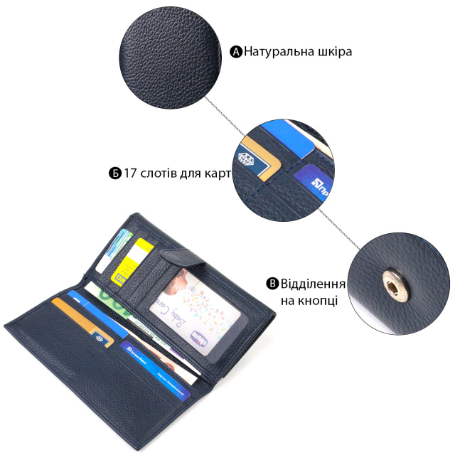 Отличный кошелек для мужчин и женщин из натуральной кожи. Аксессуар имеет одно основное отделение, семнадцать карманов для карточек, четыре прилегающих кармана и монетницу. Особенностью данной модели является наличие блока для кредитных карт, который закрывается хлястиком на кнопку. На лицевой стороне, в правом нижнем углу металлический логотип компании производителя. Если Вы выбрали товар этой фирмы, можете не сомневаться, что изделие прослужит очень долго и не потеряет свой первоначальный вид.