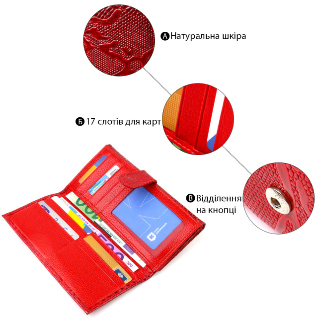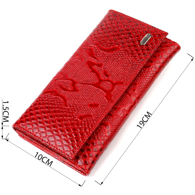 Яркий кошелек для женщин из натуральной кожи, с тиснением под рептилию. Аксессуар имеет одно основное отделение, семнадцать карманов для карточек, четыре прилегающих кармана и монетницу. Особенностью данной модели является наличие блока для кредитных карт, который закрывается хлястиком на кнопку. На лицевой стороне, в правом нижнем углу металлический логотип компании производителя. Если Вы выбрали товар этой фирмы, можете не сомневаться, что изделие прослужит очень долго и не потеряет свой первоначальный вид.