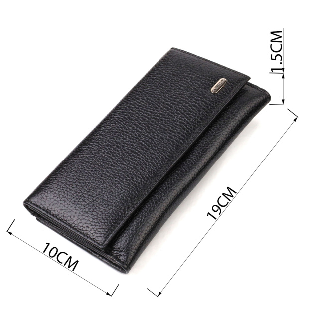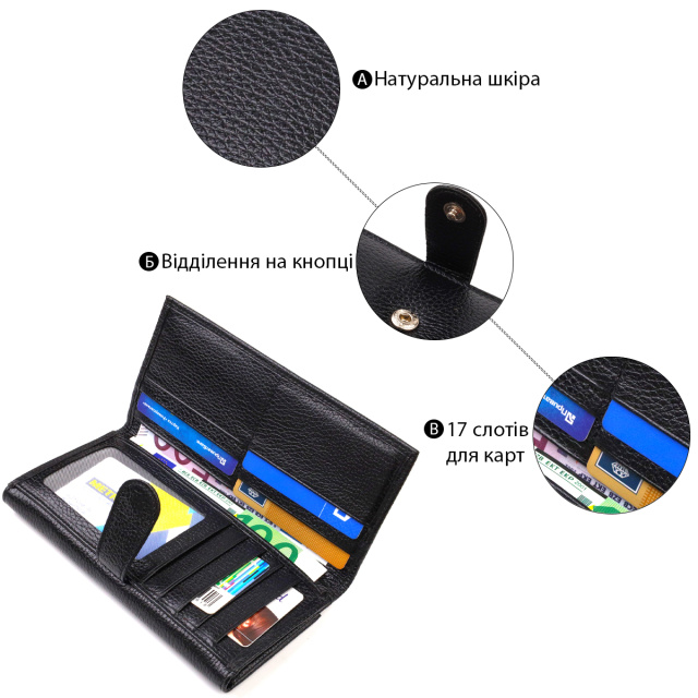 Универсальный кошелек для стильных женщин из натуральной кожи в классическом черном цвете. Аксессуар имеет одно основное отделение, семнадцать карманов для карточек, четыре прилегающих кармана и монетницу. Особенностью данной модели является наличие блока для кредитных карт, который закрывается хлястиком на кнопку. На лицевой стороне, в правом нижнем углу металлический логотип компании производителя. Если Вы выбрали товар этой фирмы, можете не сомневаться, что изделие прослужит очень долго и не потеряет свой первоначальный вид.