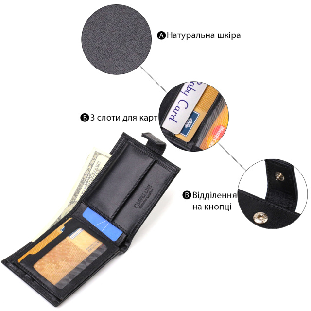 Красивое мужское портмоне небольшого размера из натуральной гладкой кожи. Аксессуар имеет основное отделение для купюр с перегородкой, три ячейки для карточек, два карманы под сеточкой, два прилегающих кармана и монетницу. Кошелек складывается пополам, закрывается хлястиком на кнопку. На лицевой стороне в правом нижнем углу, расположен металлический логотип компании производителя. Многофункциональный мужской бумажник из очень прочной кожи отличный выбор подарка для солидного мужчины.