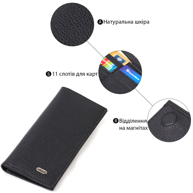 Современный мужской кошелек из натуральной кожи. Аксессуар имеет одно основное отделение для купюр всех номиналов, одиннадцать ячеек для карточек, карман под сеточкой для пропуска, два скрытых кармана и монетницу на молнии. Закрывается аксессуар в два сложения на магниты. На лицевой стороне, в правом нижнем углу металлический логотип компании производителя. Приобретая кожаный аксессуар этой фирмы, себе или на подарок, будьте уверены, что он прослужит Вам не один год.