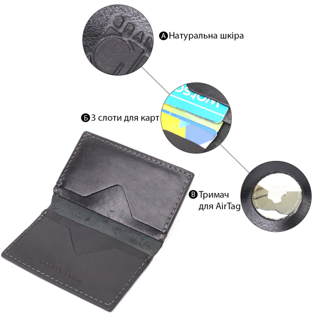 Практичный кожаный картхолдер ручной работы из натуральной высококлассной гладкой кожи. На лицевой стороне изделие имеет тисненый логотип производителя Grande Pelle. Аксессуар состоит из трех отделений под карточки. Кроме удобного функционала фишкой этого картхолдера является держатель для смарт трекера Apple AirTag, это современное устройство определяющее местонахождение вещи к которой он прикреплен. Благодаря компактным размерам аксессуара он отлично помещается в кошелек, карман или сумку любого размера, что поможет пользователям легко найти потерянные или забытые вещи. Отличный аксессуар для современного человека. Внимание, смарт трекер Apple AirTag не идет в комплект с аксессуаром!