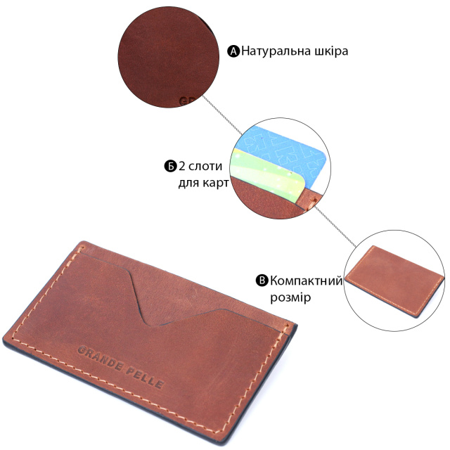 Стильный кожаный кард-кейс ручной работы из натуральной высококлассной кожи. На лицевой стороне изделие имеет тисненый логотип производителя Grande Pelle, а также прошит по краю ровной строчкой под цвет изделия. Аксессуар состоит из двух отделений под карточки. Благодаря компактным размерам аксессуара он отлично помещается в кошелек, карман или сумку любого размера. Отличный аксессуар для современного человека.