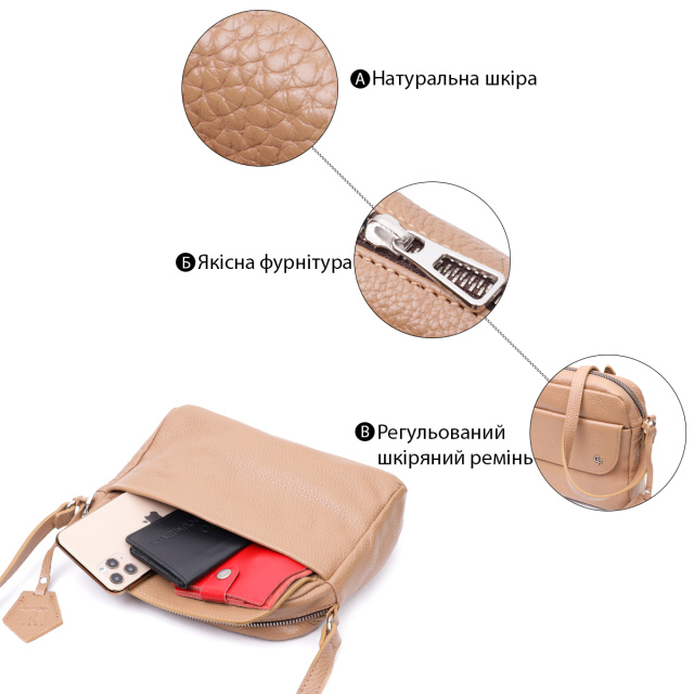 Нежная трендовая женская сумка через плече, на каждый день. Аксессуар состоит из основного отделения, что закрывается на молнию, кармана открытого типа и кармана на молнии внутри, внешнего кармана на молнии, на тыльной стороне и накладного кармана на лицевой стороне, что закрывается клапаном на магниты. Выполнена из прочной и износостойкой натуральной кожи. Фурнитура серебряного цвета, регулируемый кожаный плечевой ремень. Упакована данная сумка в красивый фирменный чехол с ручками.