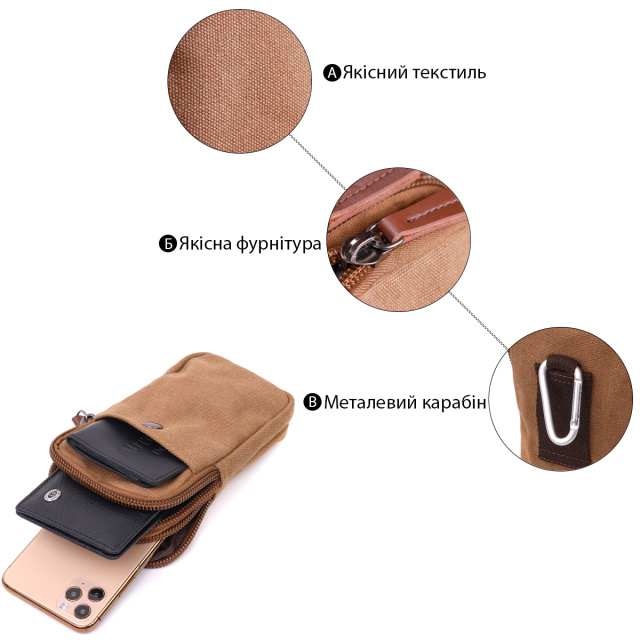 UA MarketКиївJANAВсе товарыТовари та послугиСумки мужскиеМужские сумкиКожаные мужские сумкиДобротная сумка-чехол на пояс с металлическим карабином из текстиля Vintage 22225 Коричневый