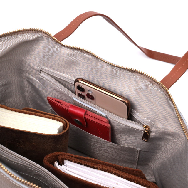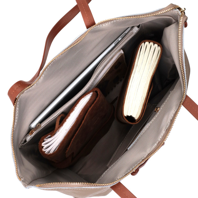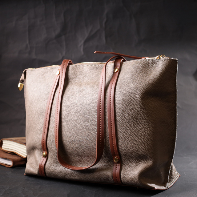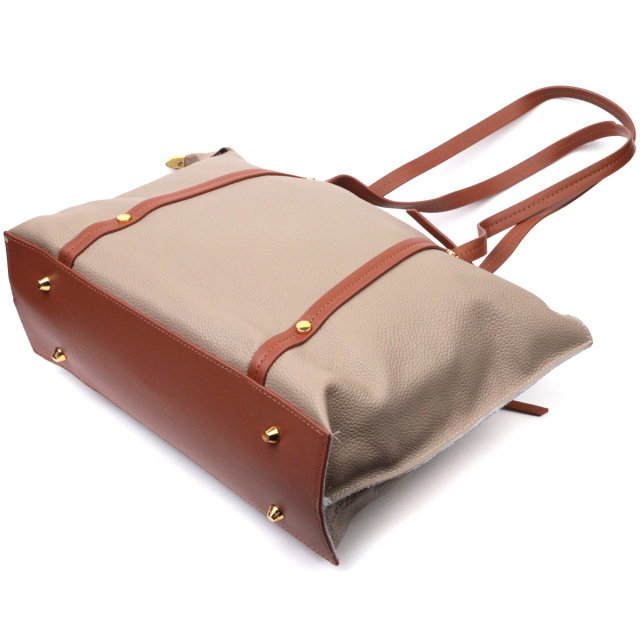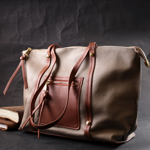 Большая женская сумка, в сочетании двух цветов бежевого и коричневого. Пошито изделие из натуральной кожи флотар, которая неприхотлива в уходе и долго носится. Аксессуар состоит из двух отделений и трех карманов на молниях разной величины. Носить сумку можно на плече и в руках, для этого имеются удлиненные кожаные ручки. В аксессуаре использована качественная фурнитура цвета желтого золота.