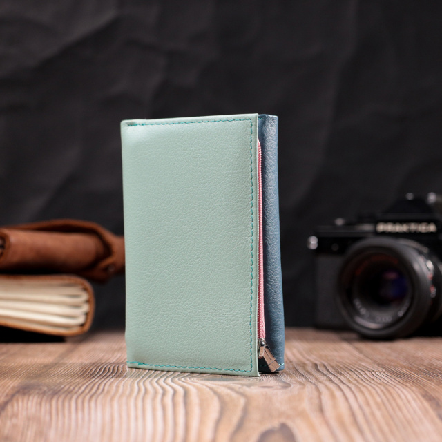 Компактное женское портмоне в три сложения из натуральной кожи высочайшего качества. Первое, что бросается в глаза это цветовое решение, вместо однотонного аксессуара мы имеем разноцветный, который содержит два основных наружных цвета и несколько дополнительных внутри. Кожаное портмоне очень практичное и служит достаточно долго. Аксессуар состоит из двух вместительных карманов для купюр, кармана на молнии через всю длину, пяти ячеек для карт, прозрачного окошка для пропуска и наружного кармана на молнии с перегородкой, что отлично прослужит для монет. Портмоне дополнено надежной фурнитурой. Укомплектован кошелек в фирменную картонную коробку белого цвета.
