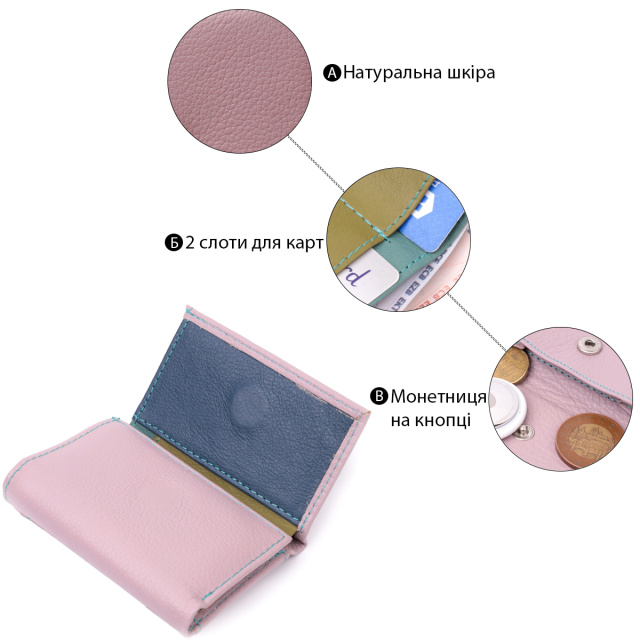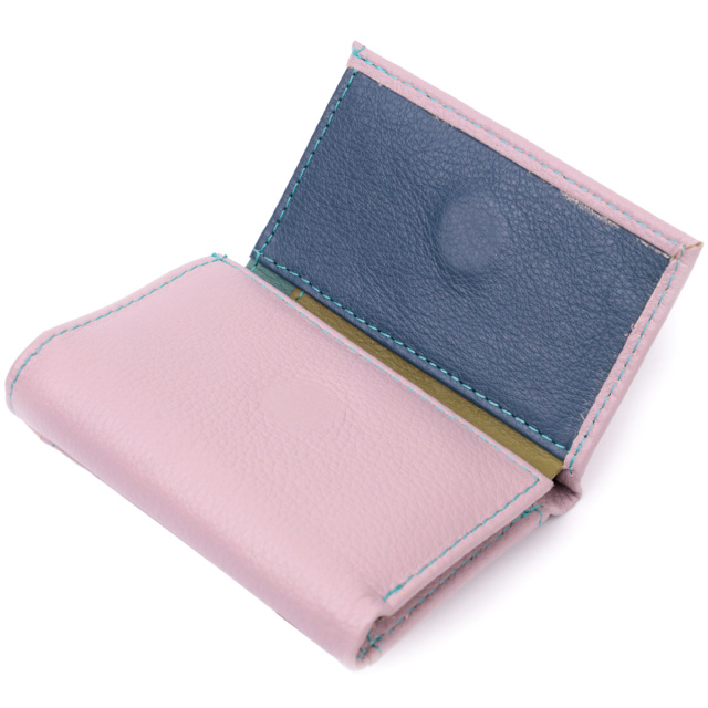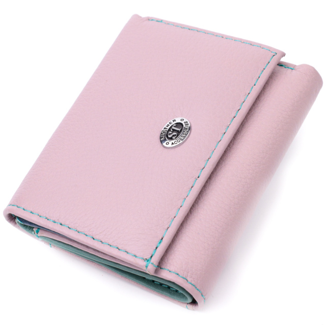 Нежное женское портмоне в три сложения из натуральной кожи высочайшего качества. Акцентом этого кошелька является цвет, точнее несколько цветов - он бежево-розового цвета снаружи и многоцветный внутри. Аксессуар состоит из двух вместительных отделений для купюр, двух ячеек для карт и кармана для монет. Снаружи изделие прошито ровной строчкой бирюзового цвета по краю и украшено металлическим логотипом компании производителя. Портмоне дополнено надежной фурнитурой и крепкой подкладкой. Укомплектован кошелек в фирменную картонную коробку белого цвета.