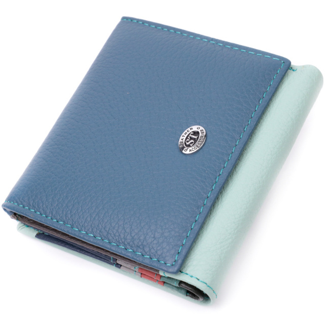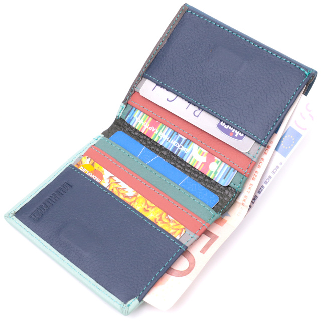 Женское идеальное портмоне в два сложения из натуральной кожи высочайшего качества. Фишкой этого кошелька является его многоцветная гамма, такой аксессуар сразу бросается в глаза, состоит он из двух вместительных отделений для купюр, шести ячеек для карт, двух скрытых карманов и кармана для монет. Снаружи изделие прошито ровной строчкой бирюзового цвета по краю и украшено металлическим логотипом компании производителя. Портмоне дополнено надежной фурнитурой и крепкой подкладкой. Укомплектован кошелек в фирменную картонную коробку белого цвета.
