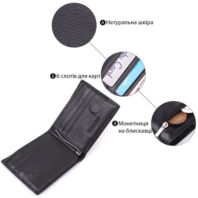 Отличный зажим для мужчин которые ценят качество и практичность. Аксессуар небольшого размера из натуральной кожи, он состоит из вместительного отделений для купюр, кармана на молнии, шести ячеек для карт, двух скрытых карманов, кармана для монет и металлического зажима. Изделие дополнено надежной фурнитурой и крепкой подкладкой, а также украшено металлическим логотипом производителя на лицевой стороне. Упакован кошелек в фирменную картонную коробку белого цвета.