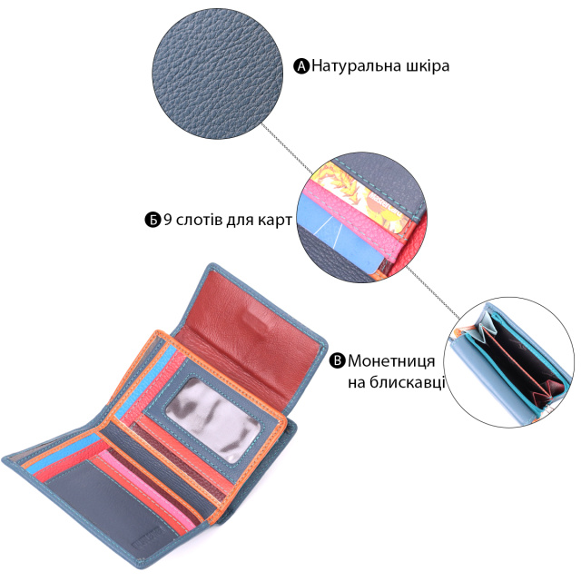 Стильный кошелек для женщин в необычном темно-бирюзовом цвете, двойного сложения, что закрывается на клапан с магнитом. Аксессуар выполнен из качественной натуральной кожи, которая отлично носится и не теряет свой первоначальный вид с годами. Отличительная особенность этой модели в яркой внутренней расцветке. Внутри есть два отделения для купюр, девять слотов для пластиковых карт, два скрытых кармана и одна монетница, что закрывается на молнию. Идеальный аксессуар для любительниц кошельков среднего размера и практичного функционала.
