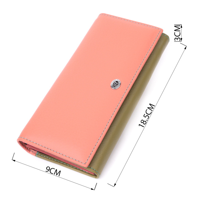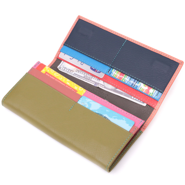 Элегантное женское портмоне в два сложения из натуральной кожи высочайшего качества. Первое, что бросается в глаза это цветовое решение, вместо однотонного аксессуара мы имеем разноцветный, который содержит два основных наружных цвета и несколько дополнительных внутри. Кожаное портмоне очень практичное и служит достаточно долго. Аксессуар состоит из четырех вместительных карманов для купюр, двух карманов на молниях через всю длину, восьми ячеек для пластиковых карт, скрытого кармана и наружного кармана на молнии, что отлично прослужит для монет. Портмоне дополнено надежной фурнитурой. Укомплектован кошелек в фирменную картонную коробку белого цвета.