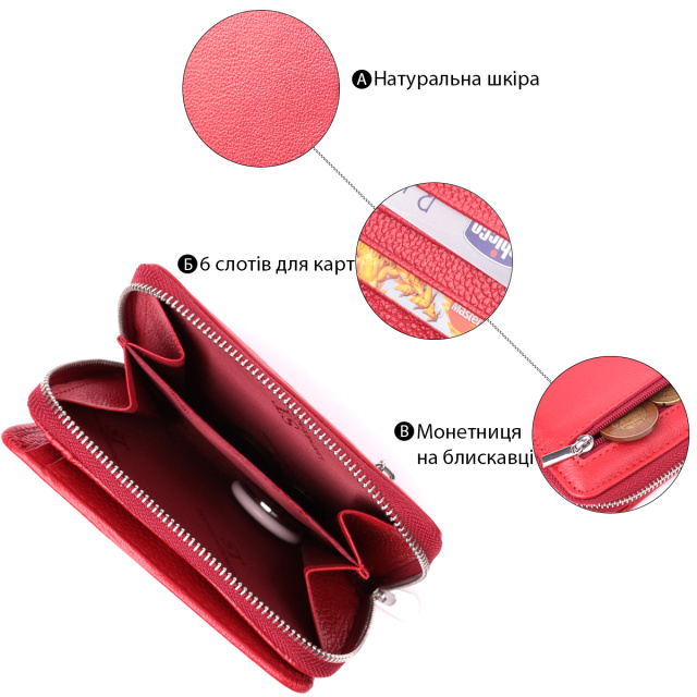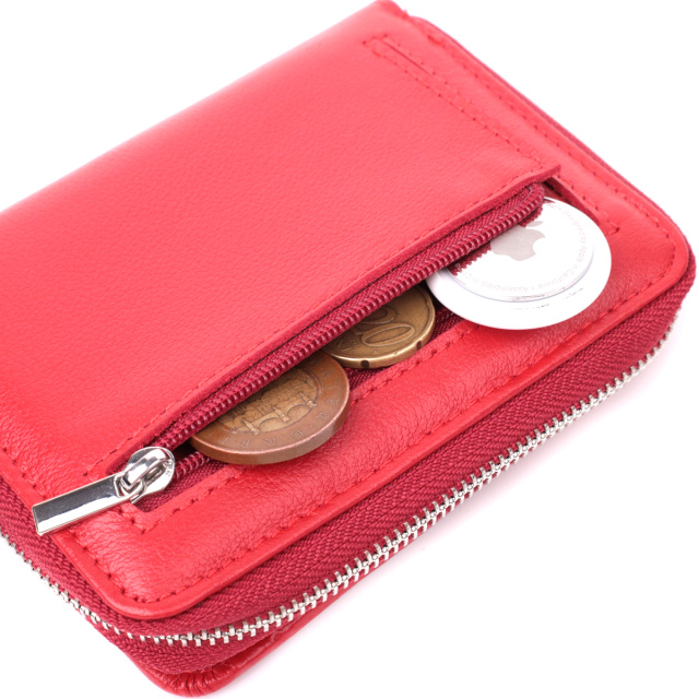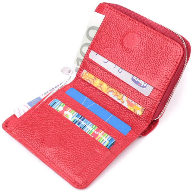 Женское портмоне красного цвета, среднего размера, что закрывается пополам на молнию. Модель пошита из качественной кожи, которая отлично проявила себя в долгосрочной эксплуатации. Аксессуар состоит из двух отделений для купюр, двух скрытых карманов, шести ячеек для пластиковых карт и монетницы снаружи. Модель упакована в коробочку, что очень удобно если изделие предназначено для подарка.