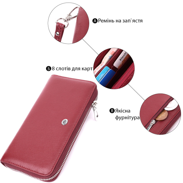Отменный клатч для деловой и стильной женщины из натуральной кожи. Аксессуар имеет три больших отделения для купюр, восемь ячеек для карточек, два прилегающих кармана, один скрытый карман, карман на молнии и монетницу на молнии снаружи. Носить данную модель удобно в руке или же при помощи съемного кистевого ремня. Закрывается аксессуар на молнию. Приобретая кожаный аксессуар этой фирмы себе или на подарок, будьте уверены, что он будет радовать глаз не один год.