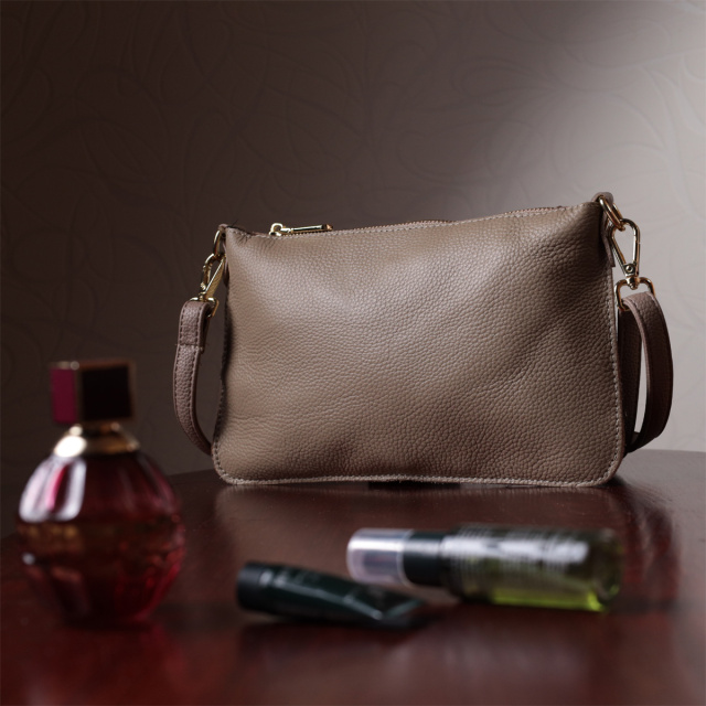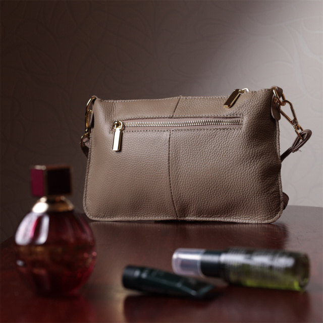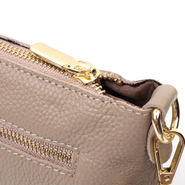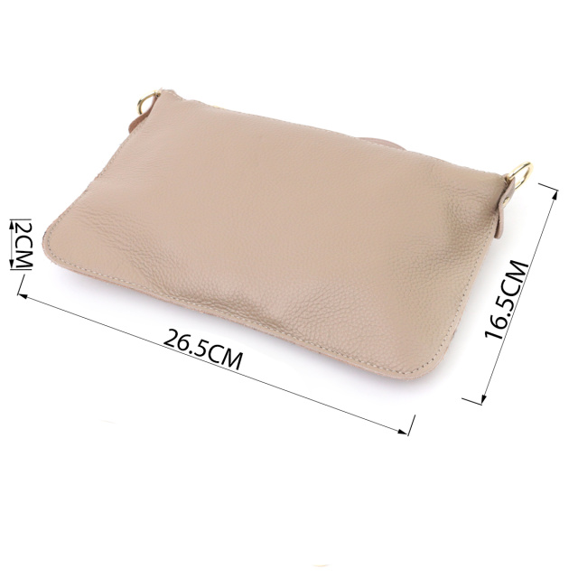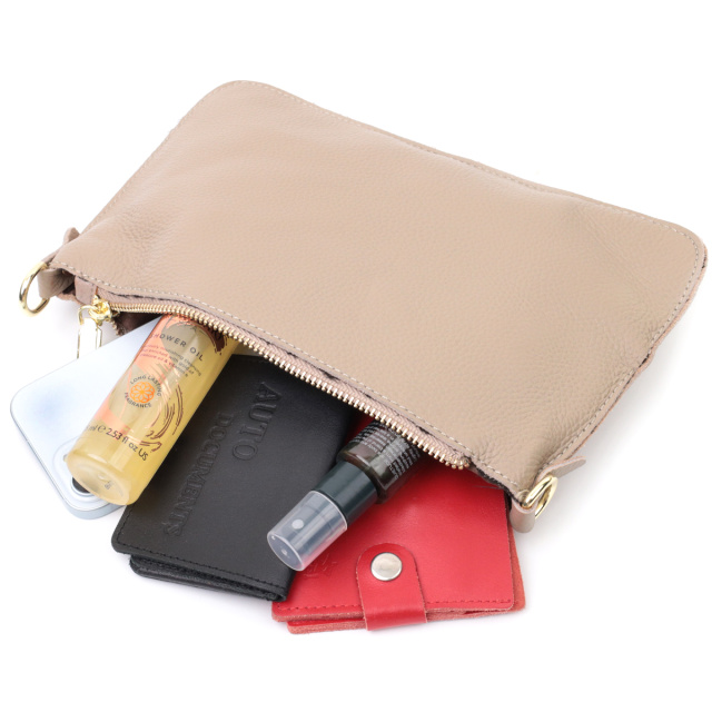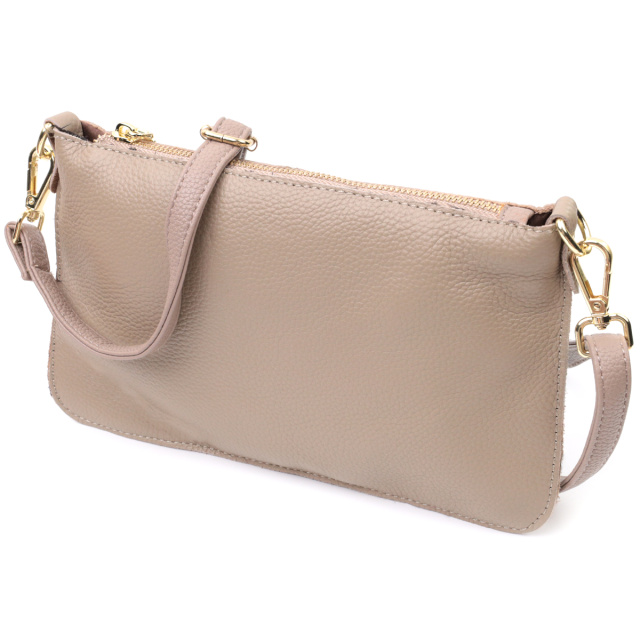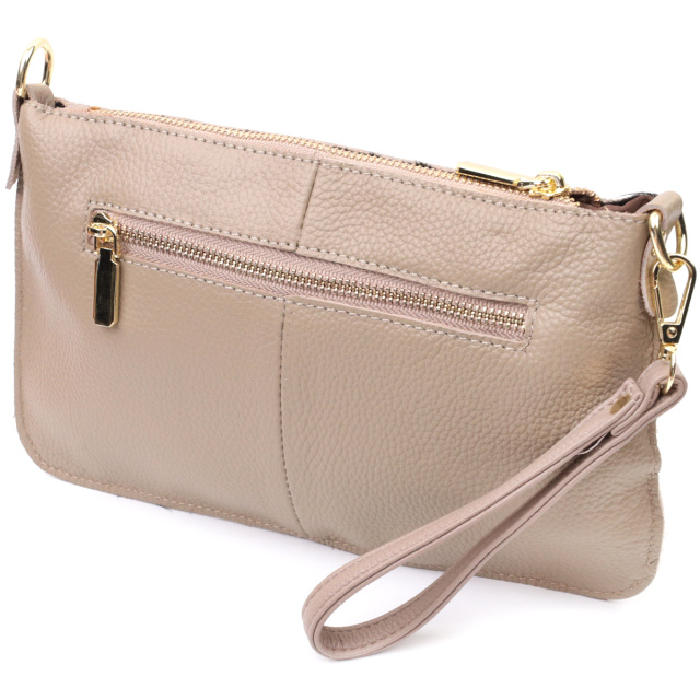 Женская функциональная сумка-клатч из натуральной кожи. Аксессуар состоит из основного отделения, что закрывается на молнию, кармана-перегородки на молнии внутри и кармана на молнии на тыльной стороне, снаружи. Носить сумку можно на плече и через плечо, также можно носить как клатч под рукой и на кисти, для этого имеется длинный съемный ремешок, а также съемный кистевой ремень.