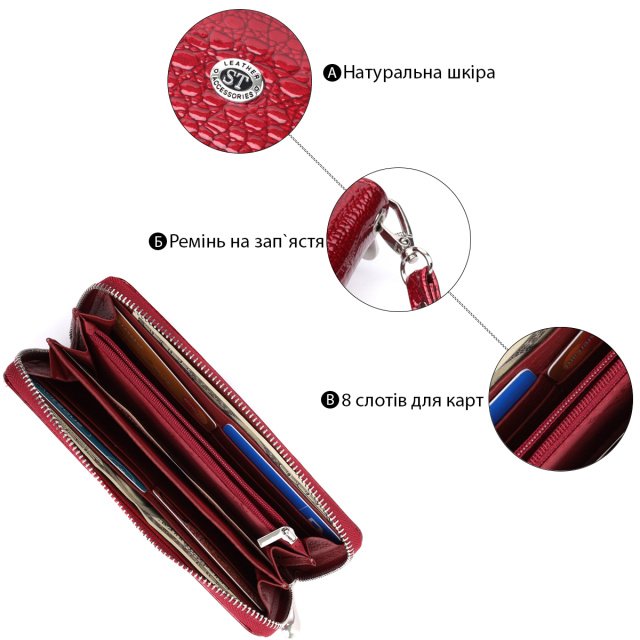 Удобный кошелек- клатч для деловых и предприимчивых людей. Выполнен из мягкой первоклассной натуральной лакированной кожи высокого качества с тиснением под рептилию. Цвет изделия – красный. Имеет одно основное отделение, которое закрывается на молнию. Внутри есть много отделений для купюр, ячеек для карт и монетница. Для удобства использования также предусмотрен съёмный кистевой ремень. Упакован аксессуар в белую плотную картонную коробку с фирменным логотипом.