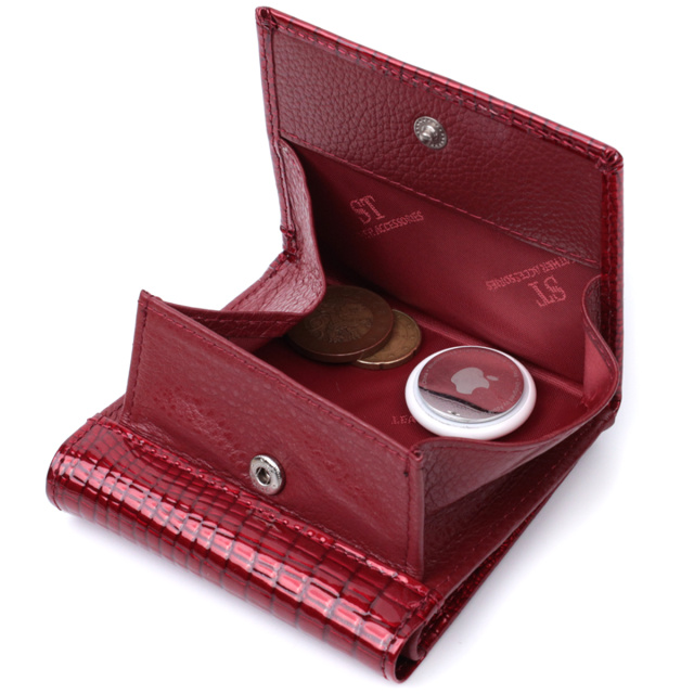 Небольшой кошелек для женщин из высококачественной лакированной кожи с тиснением под рептилию. Имеет все необходимое, чтобы стать Вам незаменимым аксессуаром в повседневной жизни. Благодаря своему компактному размеру, аксессуар легко помещается в самую маленькую сумочку. Вы с легкостью поместите в него бумажные купюры, монеты, документы, карточки. На лицевой стороне внизу посередине, расположен металлический логотип производителя, что является залогом качества изделия. Упакован аксессуар в белую плотную картонную коробку с фирменным логотипом.