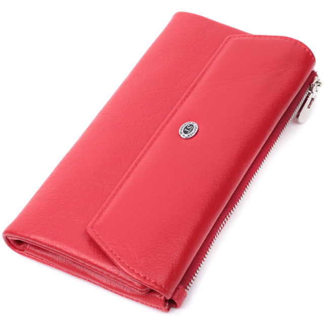 Яркий вместительный кошелек для женщин из натуральной качественной кожи. Модель имеет большой размер и закрывается на магнит. Снаружи можно увидеть отделение для монет, что закрывается на молнию. Снаружи изделие прошито ровной строчкой по краю и украшено металлическим логотипом компании производителя, которое размещено на клапане посередине. Портмоне дополнено надежной фурнитурой и крепкой подкладкой. Упакован аксессуар в белую плотную картонную коробку с фирменным логотипом.