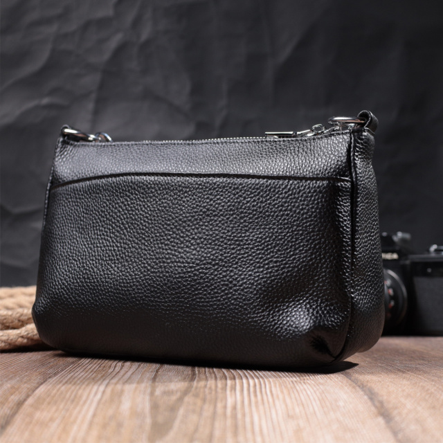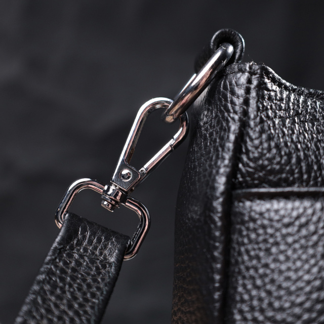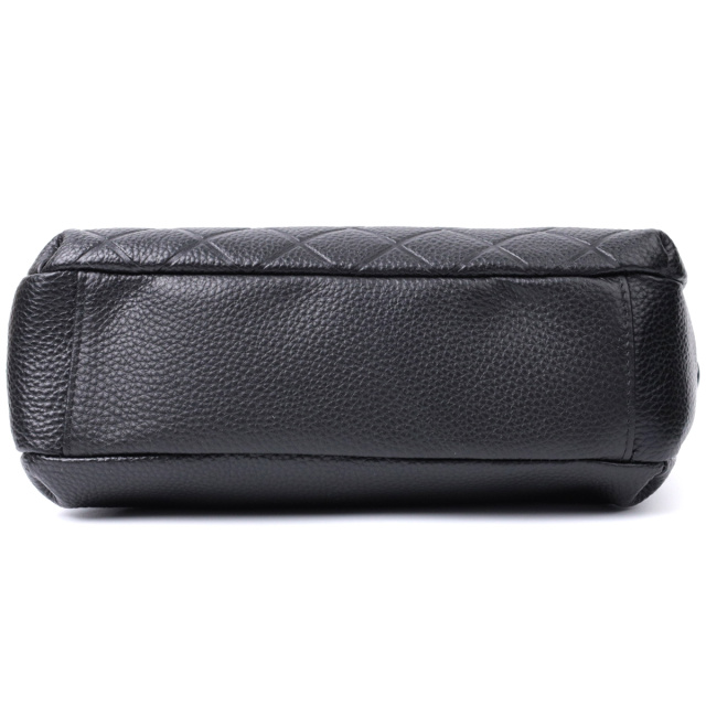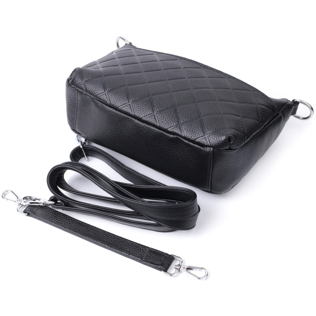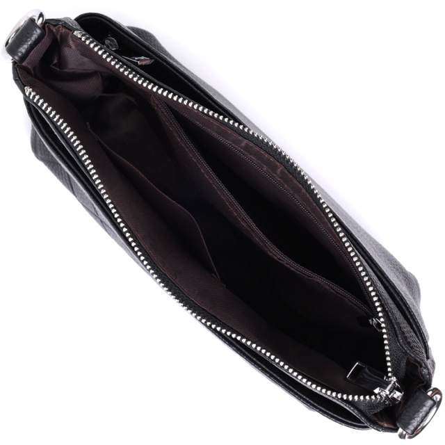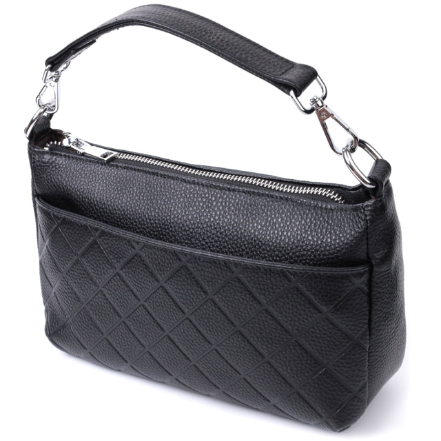 Прямоугольная сумка для женщин в классическом черном цвете из натуральной мягкой кожи высокого качества. Изделие очень удобное, можно носить на плече и в руках. На лицевой стороне сумка декорирована ромбовидным тиснением, что придает особого шарму изделию. Модель дополнена фурнитурой цвета серебра. Аксессуар имеет три отделения, и два кармашки - один на молнии и один открытого типа, в отделении, что посередине. Идеальный вариант сумки на каждый день.