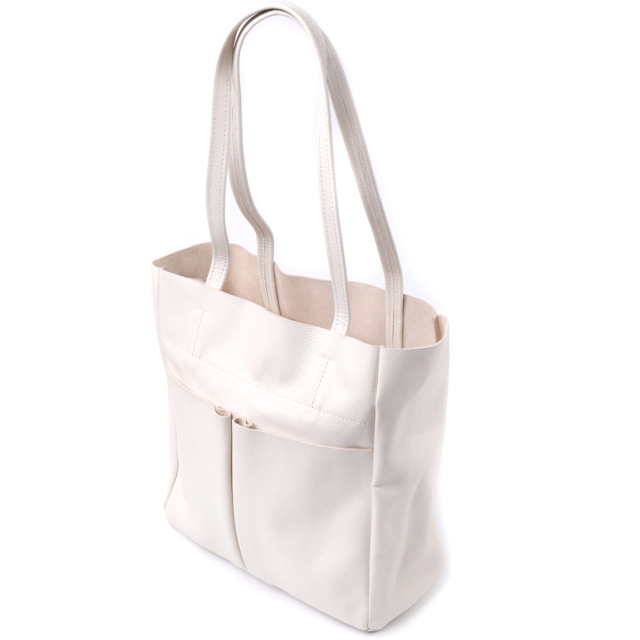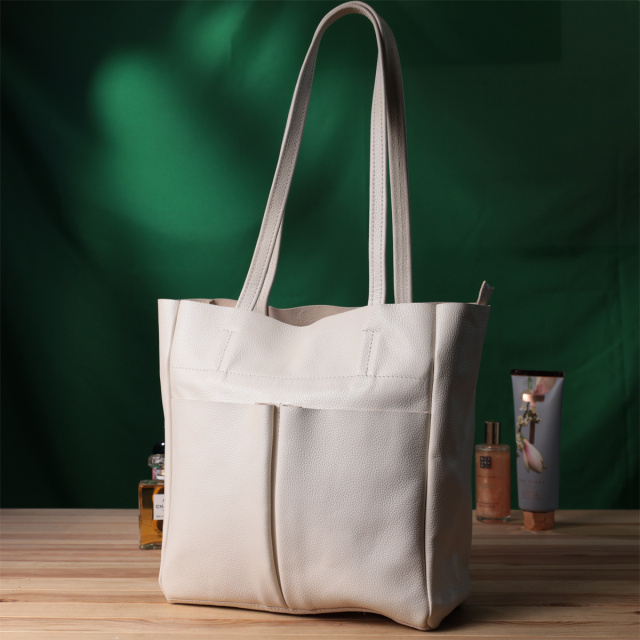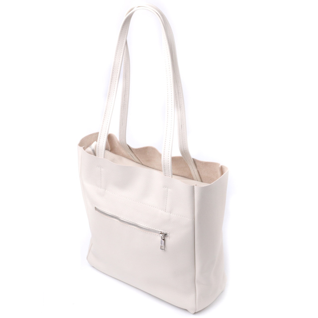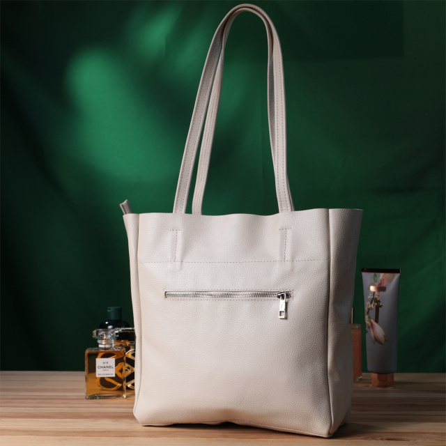 Идеальная женская сумка для тех, кто всегда носит с собой огромное количество вещей. Такую сумку можно спокойно носить на работу, в нее отлично помещаются все личные вещи а также папки с документами. Также такую модель удобно брать с собой в путешествия и выглядеть всегда стильным и элегантным. Цвет модели – бежевый, фактура – зернистая. Материал исполнения – натуральная кожа с высокими показателями стойкости к износу. Для переноски используются две крепкие надежные ручки. Сумка имеет съемное уплотненное дно прямоугольной формы, для того, чтобы придать по желанию более четких форм аксессуару. Фурнитура серебряного цвета - стойкая не меняет свой цвет в процессе носки. Аксессуар отлично сочетается со всеми стилями в одежде и может стать отличным подарком на любой праздник.