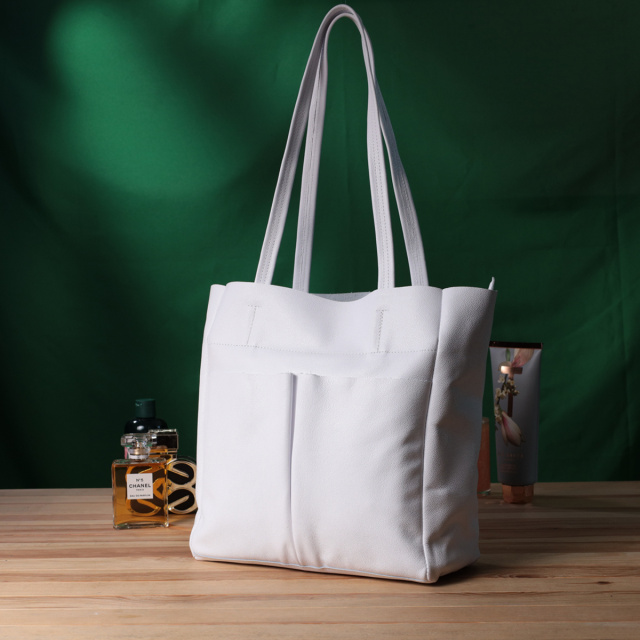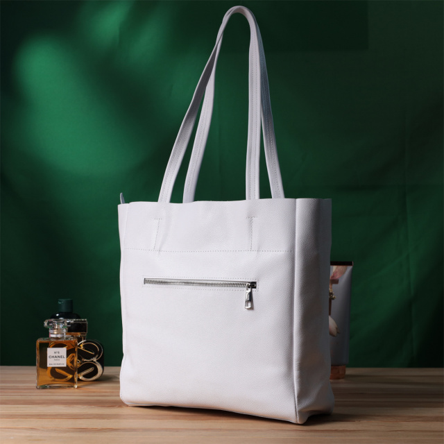 Вместительная женская сумка для тех, кто всегда носит с собой огромное количество вещей. Такую сумку можно спокойно носить на работу, в нее отлично помещаются все личные вещи а также папки с документами. Также такую модель удобно брать с собой в путешествия и выглядеть всегда стильным и элегантным. Цвет модели – белый, фактура – зернистая. Материал исполнения – натуральная кожа с высокими показателями стойкости к износу. Для переноски используются две крепкие надежные ручки. Сумка имеет съемное уплотненное дно прямоугольной формы, для того, чтобы придать по желанию более четких форм аксессуару. Фурнитура серебряного цвета - стойкая не меняет свой цвет в процессе носки. Аксессуар отлично сочетается со всеми стилями в одежде и может стать отличным подарком на любой праздник.