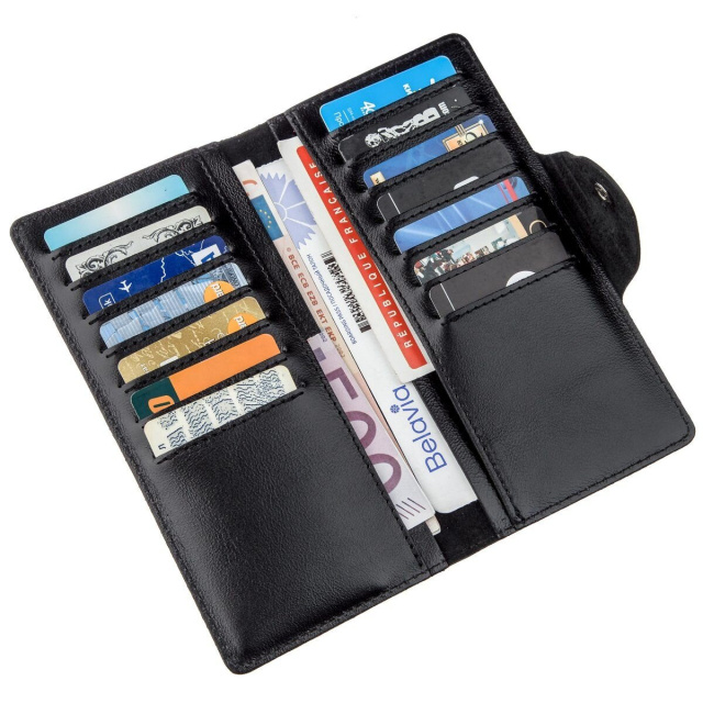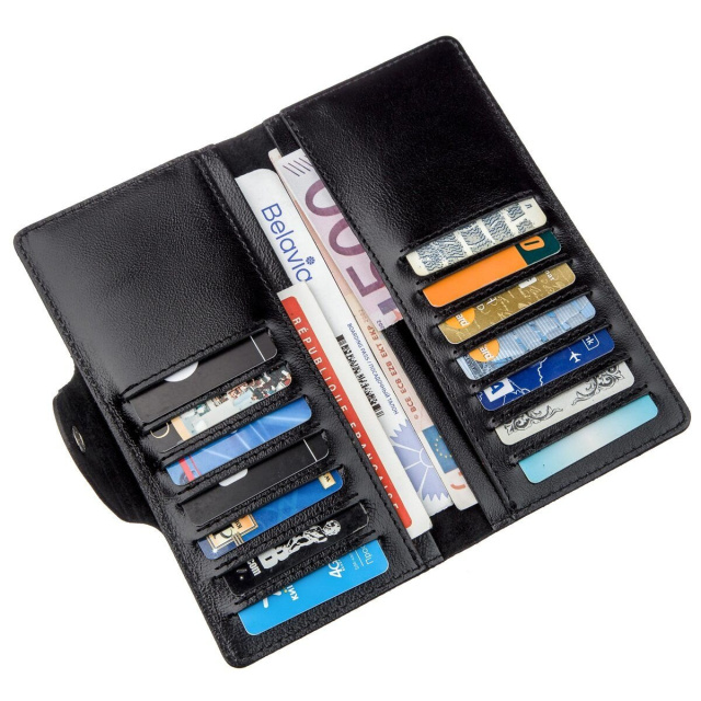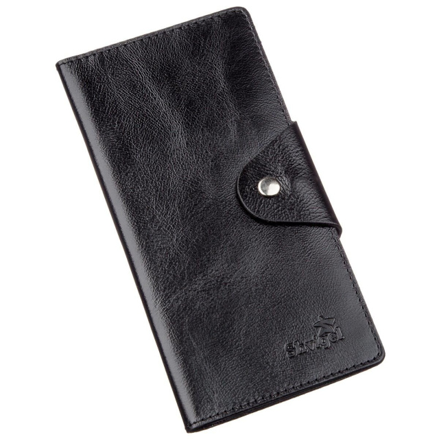 Качественный вертикальный бумажник из натуральной кожи алькор черного цвета. Отличительной особенностью такой кожи являются ее мелкие царапинки и блеск как в гладкой коже. Аксессуар очень красиво переливается на солнце. Просторные отделения для купюр и слоты для карточек будут держать ваши средства в порядке и в целостности. Аксессуар поместится в сумку или портфель. Украшена модель на лицевой стороне тисненым логотипом бренда. Закрывается изделие на одну их двух кнопок (ближнюю или дальнюю) в зависимости от его наполненности. Если вы находитесь в поиске подарка – советуем вам данную модель. Она доступна в разных цветах.