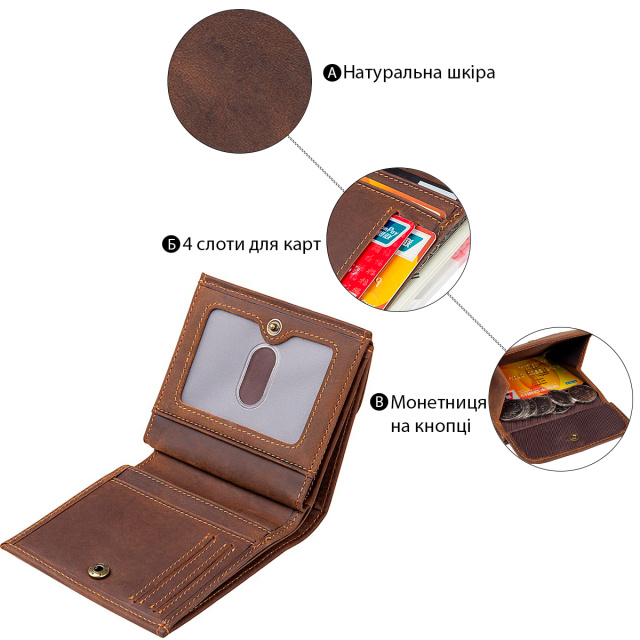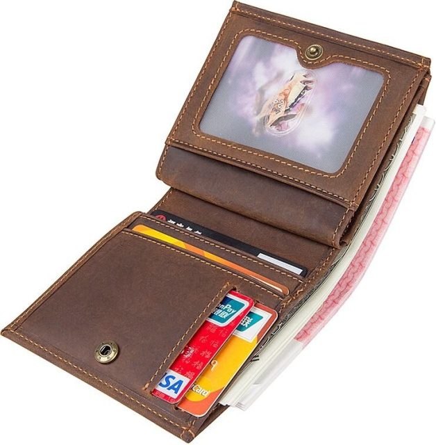 Стильный небольшой кошелек из высококачественной натуральной винтажной кожи, особенность этой кожи в том, что она очень чувствительная к прикосновениям, на ней быстро и легко появляются царапинки, так что уже спустя 2-3 недели использования можно смело называть свое изделие уникальным и неповторимым. Со временем кожа затирается и шлифуется, так что некоторые следы исчезнут сами собой.