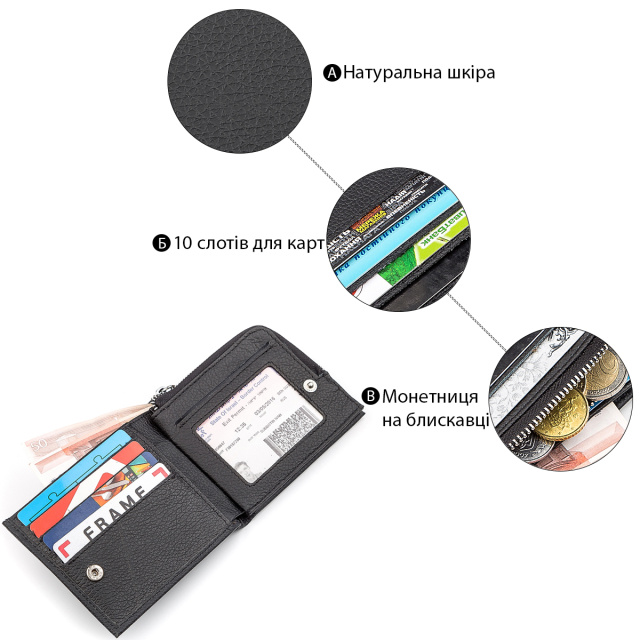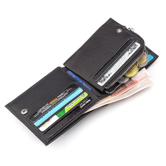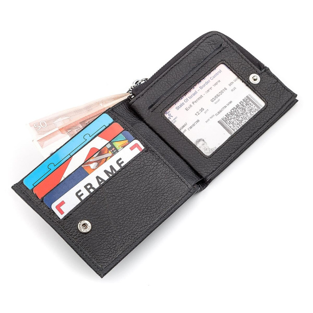 Классический стиль данной модели предусматривает фиксацию клапана на специальной кнопке. Природная фактура натуральной говяжьей кожи не оставит равнодушной ни одну модницу. Во внутреннем функционале есть несколько отделений для купюр, одно из которых дополнено молнией и 10 слотов для кредиток или визитных карточек. Также, имеется отделение на змейке и окошко, где можно раcположить права или удостоверение личности. Кошелек предлагается в подарочной упаковке от производителя.