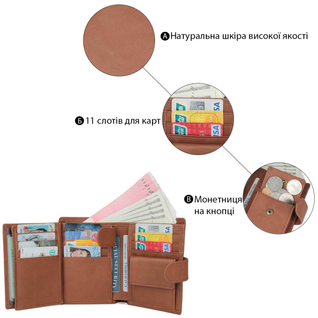 - 3 отделения для банкнот, одно из которых закрывается молнией;