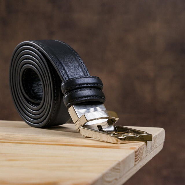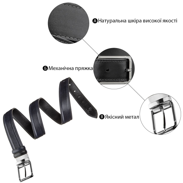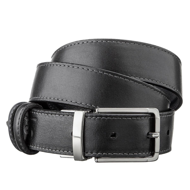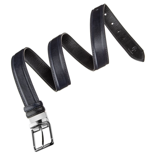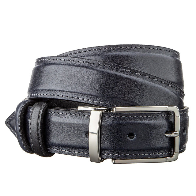 Модный ремень из цельной итальянской кожи. Уникальной особенностью такого ремня является то, что вы можете носить его любой стороной или черной или синей. Это ремень соединяет в себе 2 цвета в одном. Такой аксессуар просто находка для тех, кто не хочет покупать 2 ремня разных цветов. Модель прошита ровной строчкой по краям ремня. Производитель, использует исключительно импортную фурнитуру, которая не темнеет, не царапается и не вызывает аллергии. Такой кожаный ремень всегда дополнит гардероб как молодого, любящего себя человека, так и будет дополнением к образу солидного мужчины.