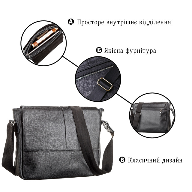 Замечательная сумка в деловом стиле из качественной натуральной кожи. Сумка имеет просторное внутреннее отделение, в котором можно разместить документы формата А4 и даже небольшой ноутбук. Прочный текстильный ремень регулируется по длине.