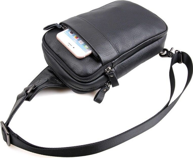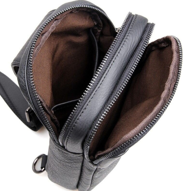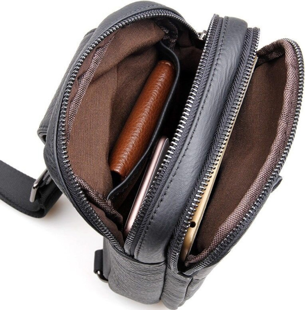 На лицевой стороне аксессуара расположен накладной карман который застегивается змейкой, на задней внешней стенке прорезной карман на застежке.