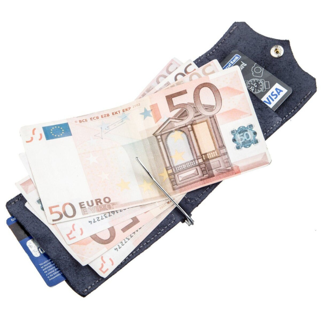 Компактный зажим из итальянской натуральной кожи высочайшего качества синего цвета. На лицевой стороне аксессуара тисненый логотип бренда-производителя и ровна синяя строчка по краям аксессуара. Зажим станет для вас идеальным решением, если вы не являетесь поклонником портмоне или клатчей. За счет своего компактного размера зажим легко поместится в карман или небольшую сумку. Вы также можете положить в него пару необходимых кредиток Сама конструкция зажима изготовлена из надежного металла. Изделие станет прекрасным подарком для близкого человека. Модель упакована в войлочный чехол.