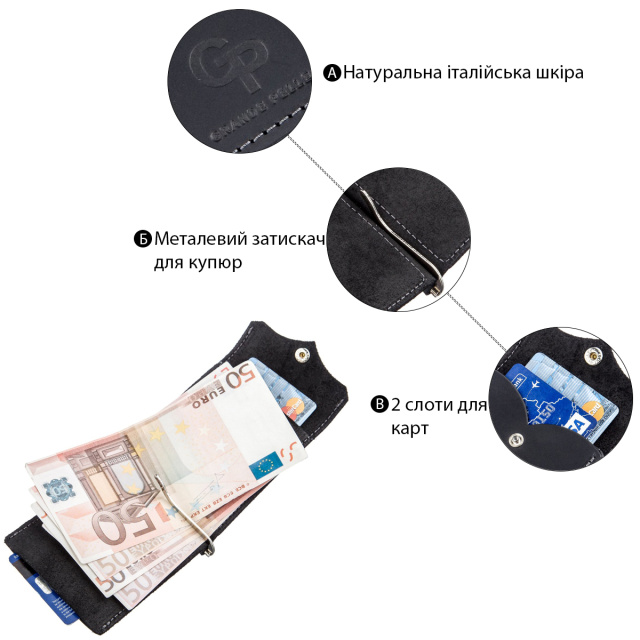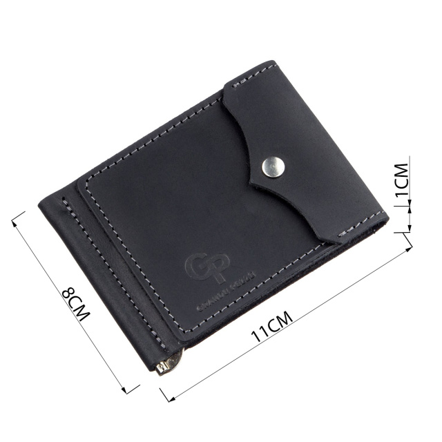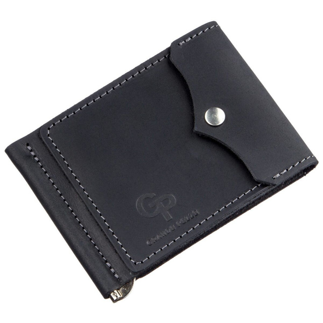 Черный компактный зажим из итальянской натуральной кожи высочайшего качества. На лицевой стороне аксессуара тисненый логотип бренда-производителя. Зажим станет для вас идеальным решением, если вы не являетесь поклонником портмоне или клатчей. Минимальный размер легко поместится в карман или маленькую сумку. Закрывается изделие на кожаный хлястик с кнопкой. Сама конструкция зажима выполнена из надежного металла серебристого цвета. Такой аксессуар станет прекрасным подарком на любой праздник.