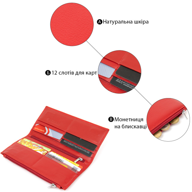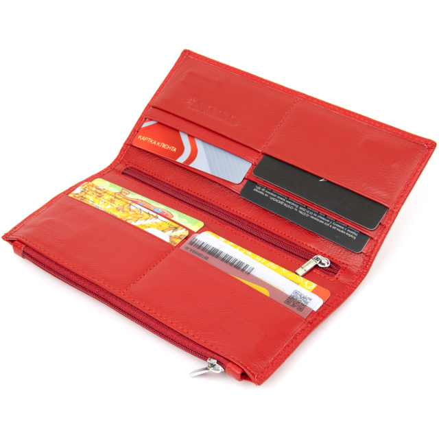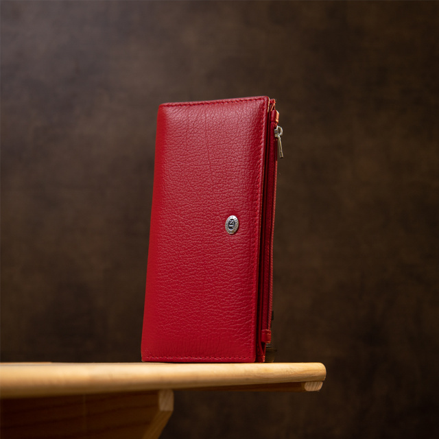 Материал: натуральная кожа. Цвет: красный. Размеры (ШхВхГ, см): 19х9,5х1,5 см. Страна производитель: Китай. Бренд: ST Leather. Описание: - основное отделение закрывается на магнит; - монетница на молнии на внешней стороне; - внутри расположено два больших отделения для купюр по всей длине; - одно большое отделение на молнии по всей длине; - 12 отделений для карточек; Яркий и женственный кожаный кошелек для не менее ярких личностей. Имеет красивый насыщенный цвет и практичный функционал. Вас порадуют вместительные отделения для купюр, различных карточек и легкодоступная монетница на молнии. Для особо ценных мелочей предусмотрено внутреннее отделение на молнии на всю длину кошелька. Данное изделие также может стать отличным подарком для близкого человека.