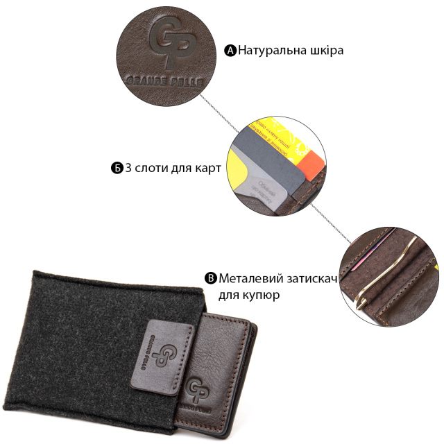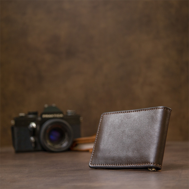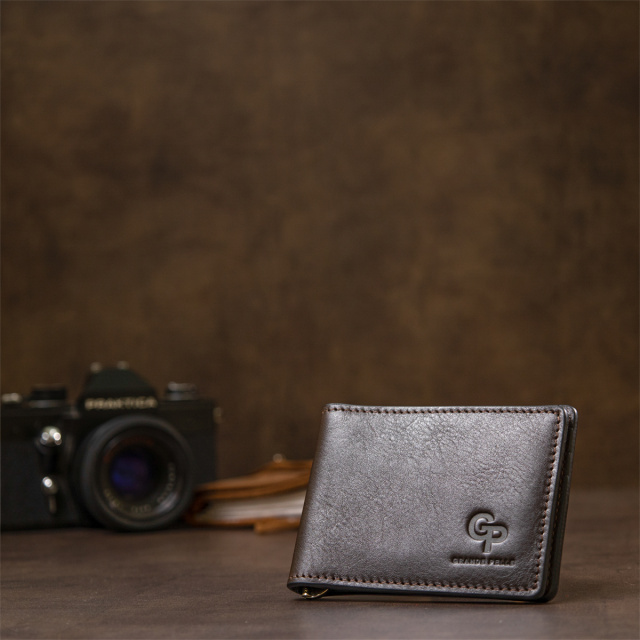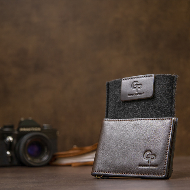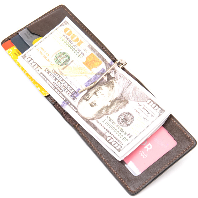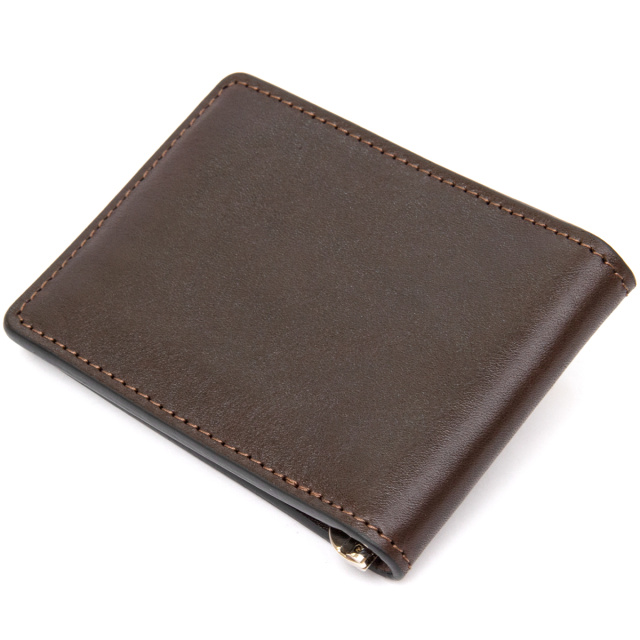 Красивый кожаный зажим для денег для тех, кому надоели большие кошельки. Данное изделие легко поместится в сумку или в карман брюк, при этом Вы не почувствуете дискомфорт. Цвет – темно-коричневый с глянцевым отливом. Кожа на ощупь мягкая и приятная. Прекрасно подойдет в качестве подарка, для этого он упакован в специальный фирменный чехол.