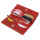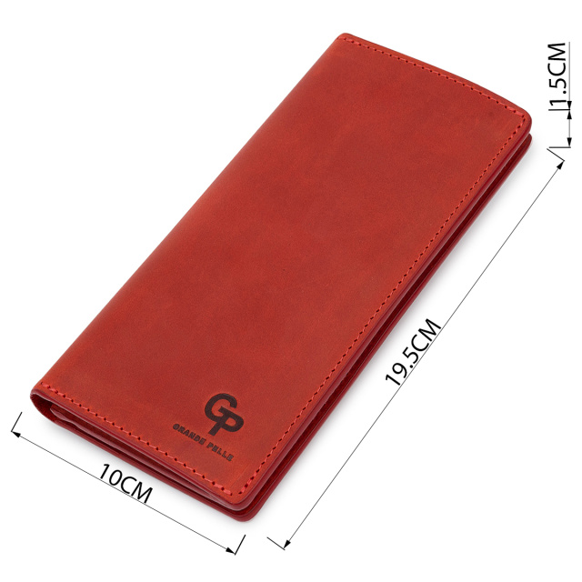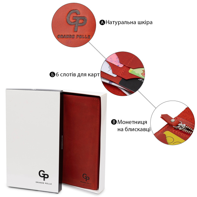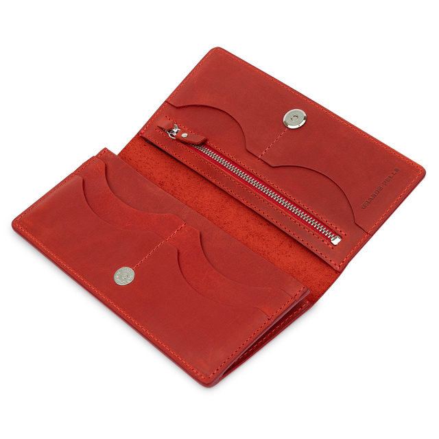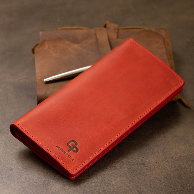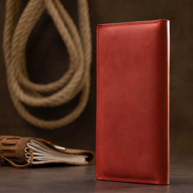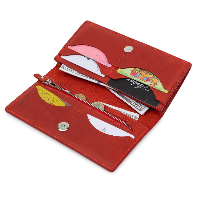 Женское кожаное портмоне с гладкой матовой фактурой, что очень приятно на ощупь. Выполнено изделие в насыщенном красном цвете с аналогичными строчками по периметру. Внутри есть три вместительных отделения на всю длину для купюр и прочих бумаг, монетница на молнии, а также шесть удобных слотов для пластиковых карт. Упаковано портмоне в картонную коробку.