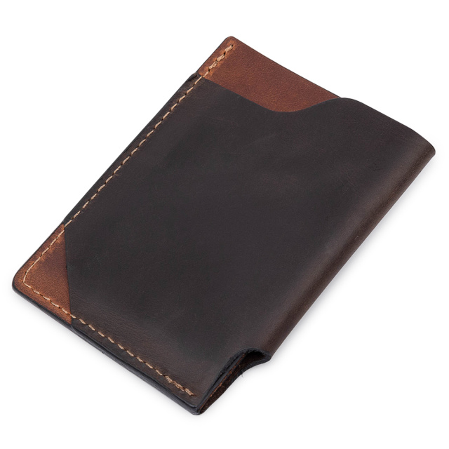 Необычный картхолдер из натуральной кожи высокого качества. Имеет гладкую матовую фактуру и красивое сочетание коричневого цвет разных оттенков. На лицевой стороне есть тиснение логотипа бренда. Упаковано изделие в фирменный чехол, поэтому может стать хорошим презентом для близкого человека.
