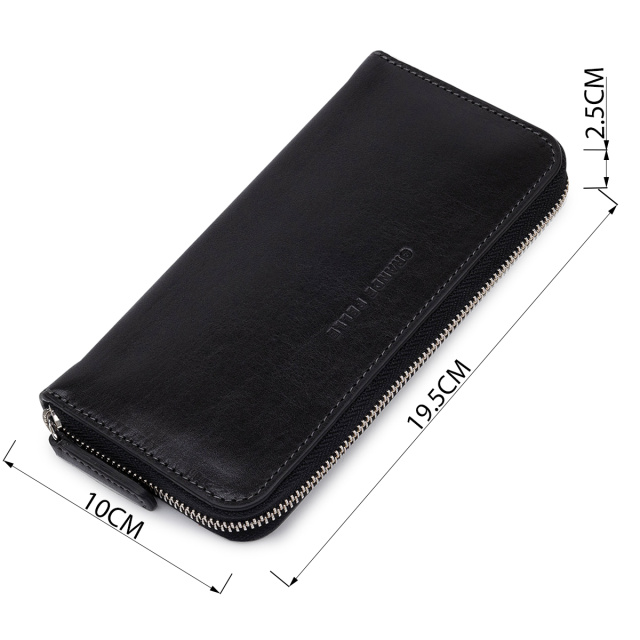Превосходный вместительный кошелек на молнии из натуральной высококачественной кожи. Имеет красивый черный цвет и гладкую фактуру. Внутреннее наполнение хорошо продуманное и практичное, в нем поместятся купюры, монеты, различные карточки и др. Упакован данный кошелек в фирменную картонную коробку с логотипом бренда.