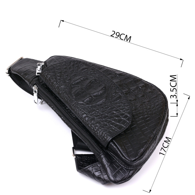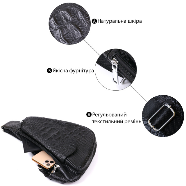 Небольшая сумка через плечо из натуральной высококачественной кожи с тиснением под рептилию. Имеет два вместительных отделения на молнии и дополнительный карман на тыльной стороне. Ремень выполнен из высокопрочного текстиля и может регулироваться по длине. Цвет данной модели – универсальный черный, а значит подойдет под любой цвет одежды.