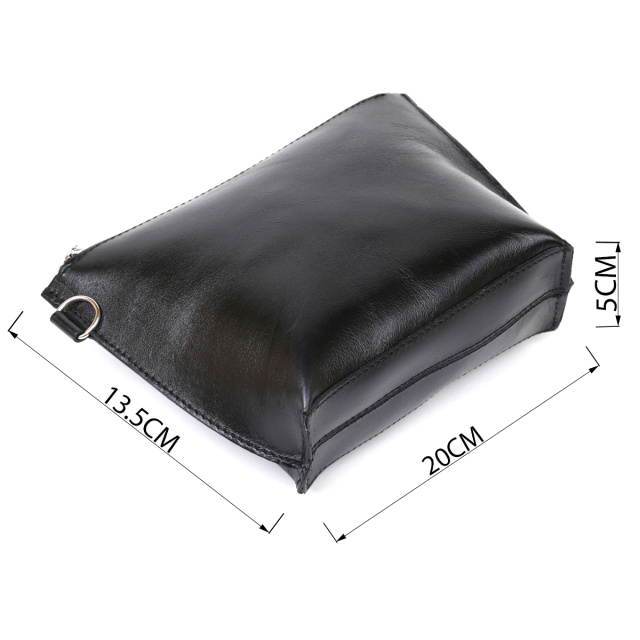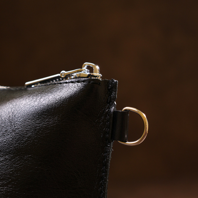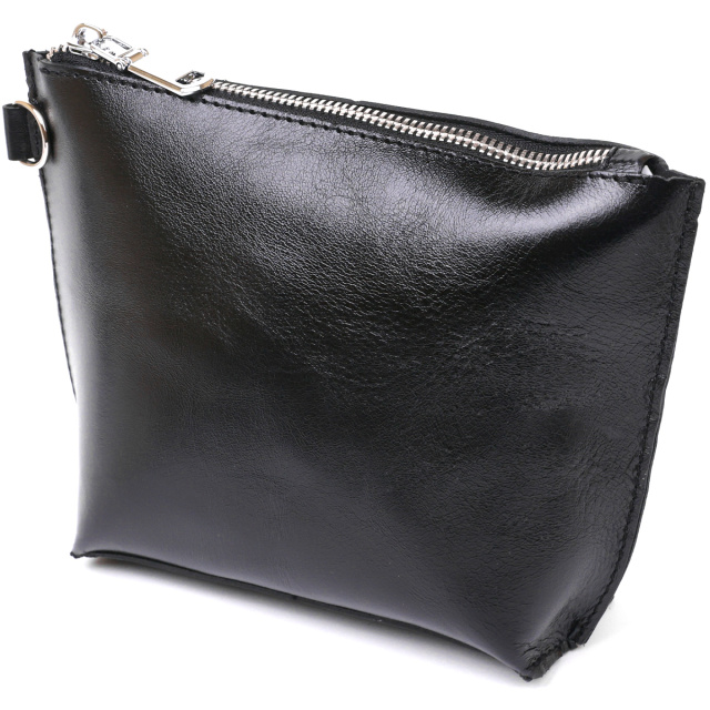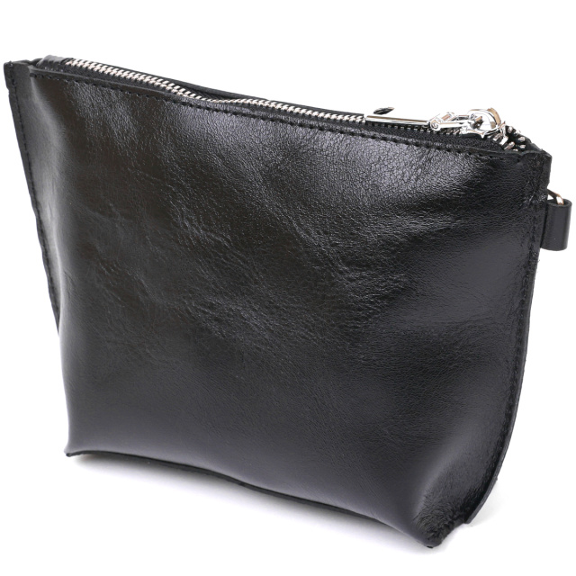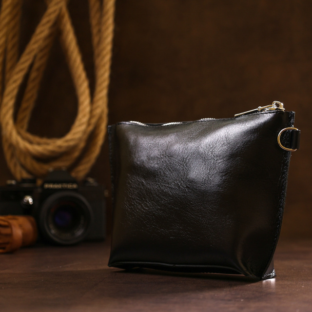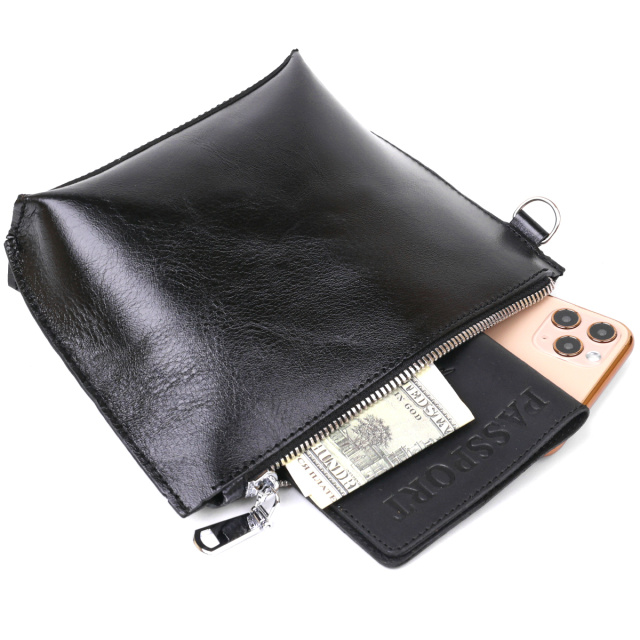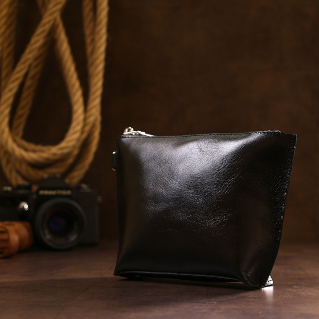 Практичный и полезный аксессуар для повседневного использования или для путешествий, куда могут поместиться мелкие ценные вещи. Материал – натуральная кожа высокого качества с отличными эксплуатационными показателями. Цвет изделия – классический черный с легким блеском, фактура – гладкая и приятная на ощупь. Закрывается данная модель на молнию.