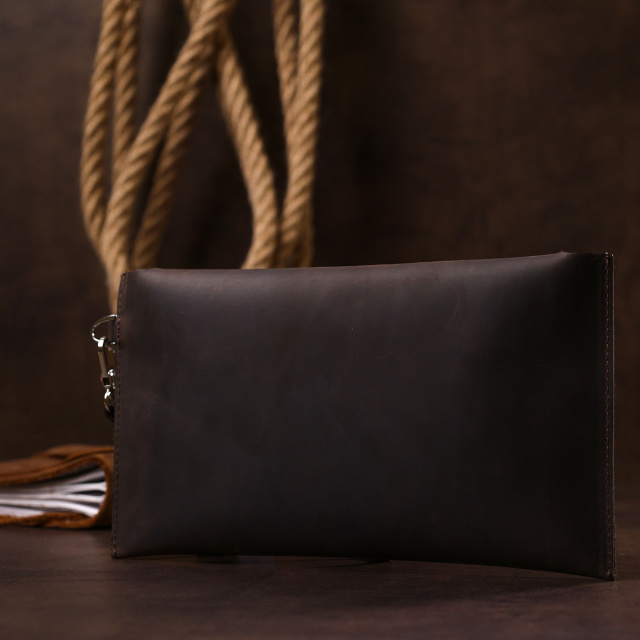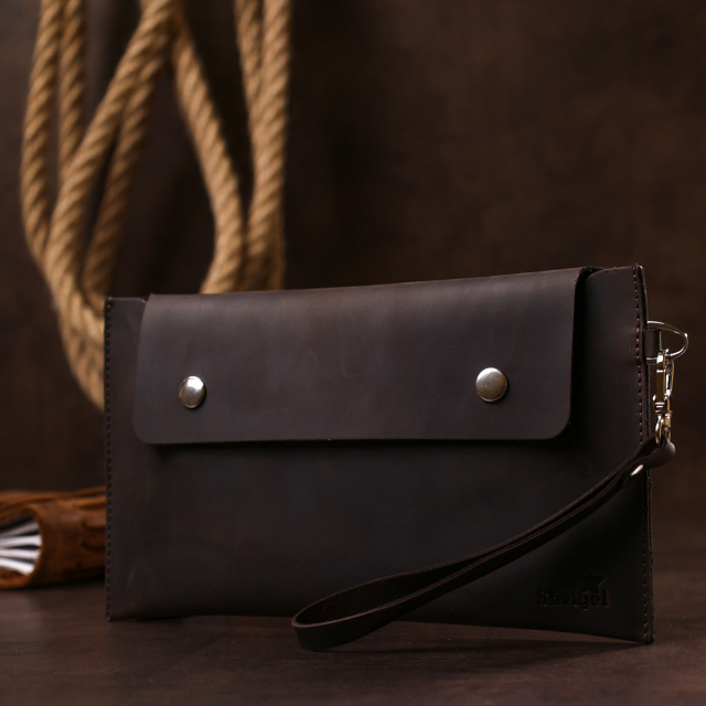 Мужская винтажная тревел-косметичка для хранения ценных вещей и документов. Выполнена из натуральной высококлассной кожи украинским производителем. Цвет изделия – матовый темно-коричневый, фактура – гладкая и очень приятная на ощупь. Закрывается на удобный клапан с двумя кнопками в цвете под серебро. Ремешок отстегивается и выполнен также из натуральной кожи.