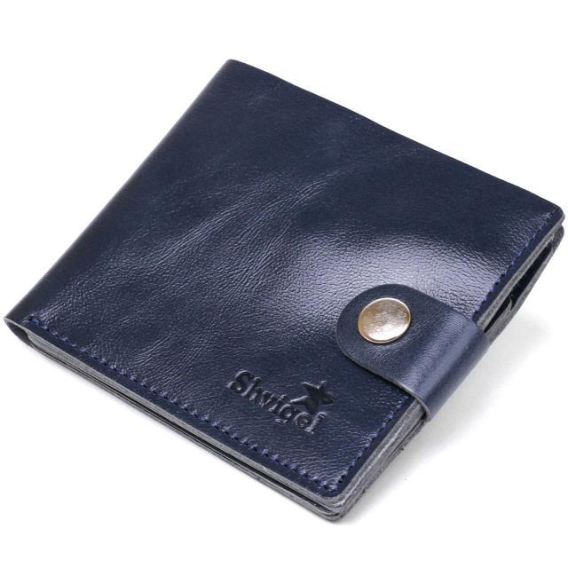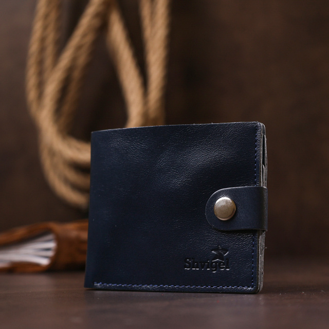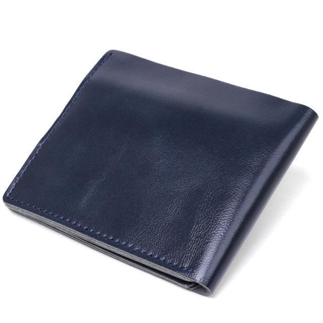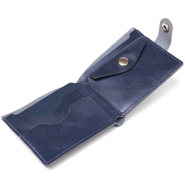 Компактное стильное портмоне в стильном аккуратном дизайне. Выполнен аксессуар из натуральной кожи высокого качества и повышенной стойкостью к износу. Внутри есть просторное основное отделение на всю длину, карманы для пластиковых карточек и монетница на кнопке. Цвет изделия – темно-синий, фактура – гладкая.