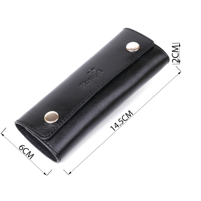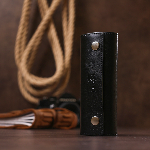 Добротная ключница из натуральной кожи от украинского производителя с отличными характеристиками износоустойчивости. Цвет изделия – универсальный черный с легким блеском, фактура – гладкая. Внутри расположены шесть небольших карабинов для ключей. Закрывается аксессуар на две кнопки в цвете под серебро.